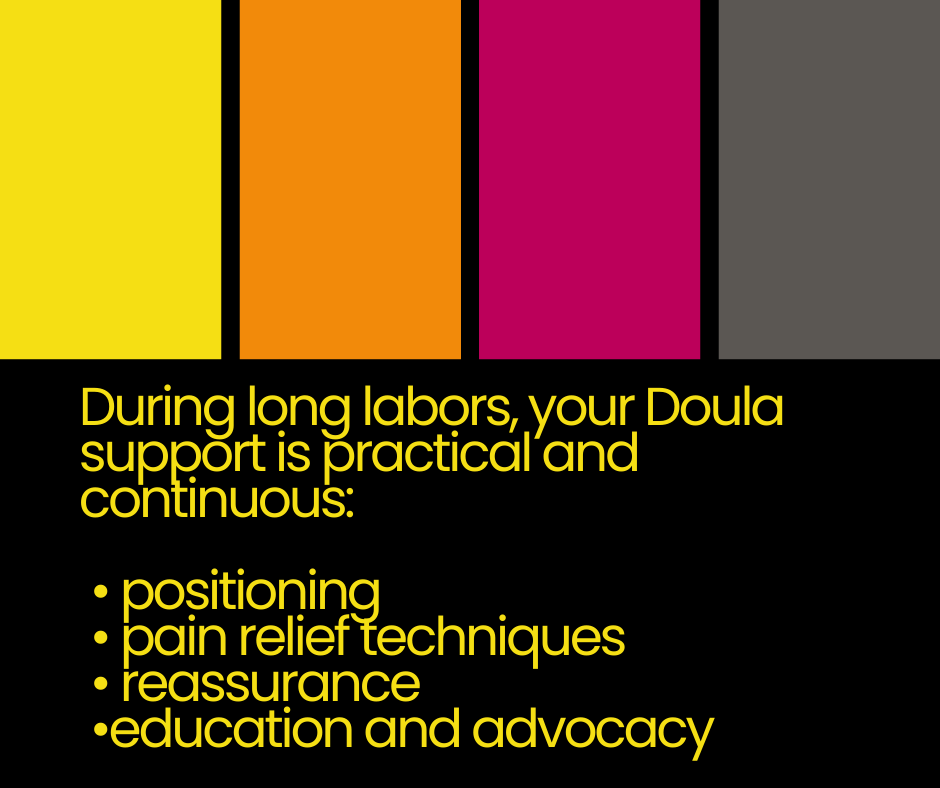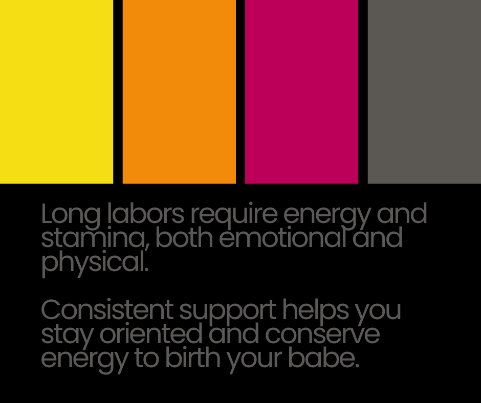 A doula’s role during extended labors includes physical support, pacing, partner guidance, and helping clients stay oriented as labor unfolds. This consistency can make a significant difference in how people experience labor — especially when plans change or progress is slow.