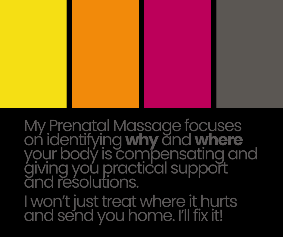Massage that focuses only on the painful areas can miss the bigger picture. My Prenatal Peace Massage is designed with your pregnant body and your optimal fetal positioning in mind. My work looks at how structures work together and why discomfort shows up where it does.